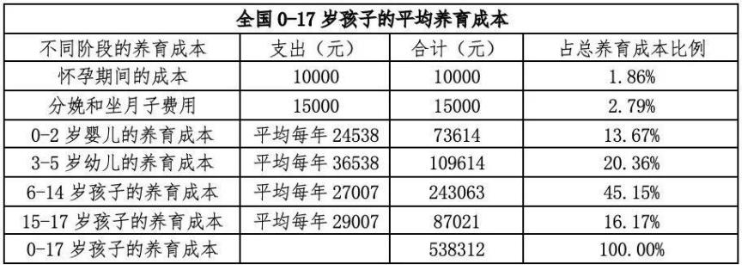 據(jù)《中國生育成本報告2024版》統(tǒng)計,全國家庭0-17歲孩子的養(yǎng)育成本平均為53.8萬元,而0歲至大學(xué)本科畢業(yè)的養(yǎng)育成本平均為約68萬元。