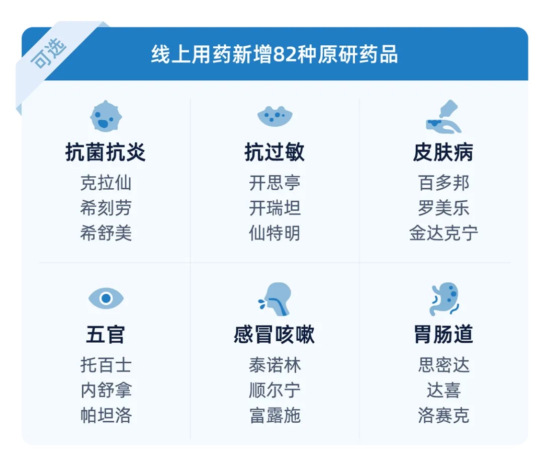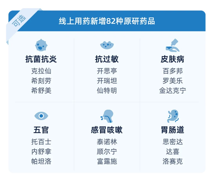 門診原研藥免費(fèi)新增82種,療效更好,比如我們常用的希舒美、達(dá)喜、開瑞坦等,日常用藥品質(zhì)直接拉滿。